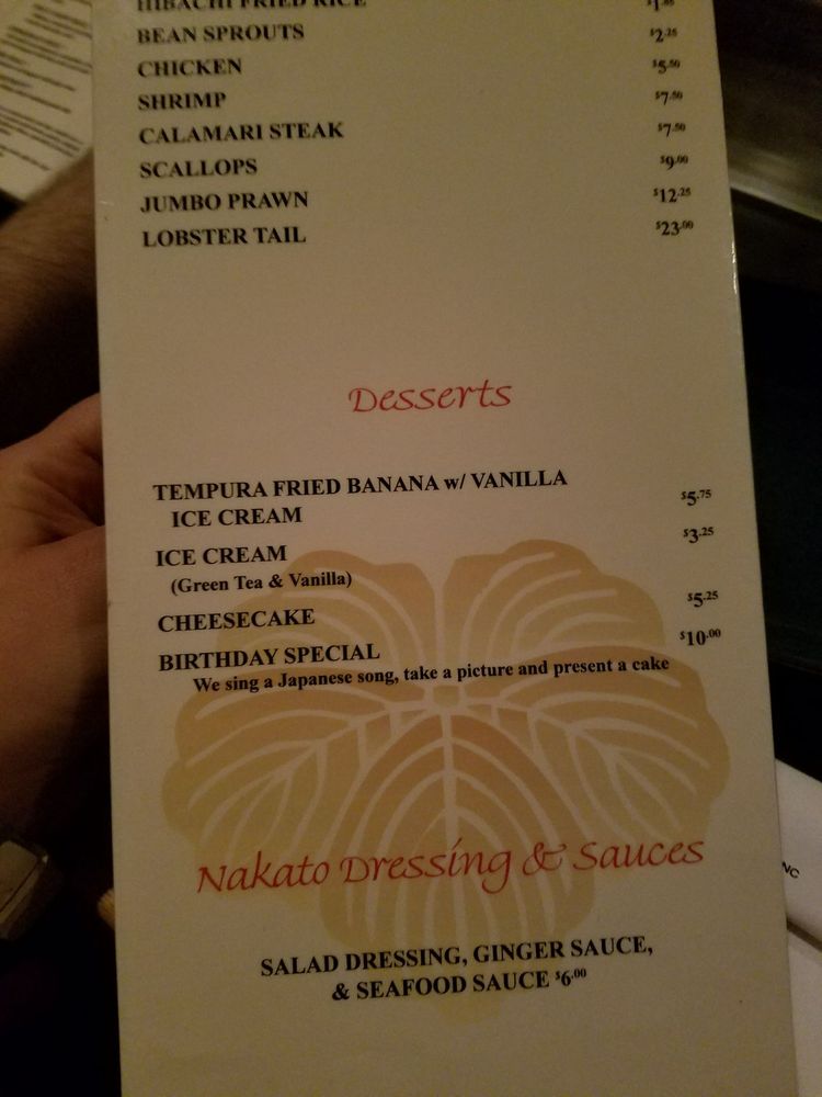 “ I thoroughly enjoyed a birthday dinner at Nakato last night! It's been like a decade since I've gone to this type of restaurant so I was nervous excited lol. We had a reservation for 7:30, for a group of 4. We weren't seated until 7:45 and a server didn't come over until almost 8pm, so that was annoying. They were pretty busy, but the issue with this was they closed at 9pm. Towards the end of dinner I felt very rushed to eat because they were trying to close down. I get it, but it took them 30 minutes to even get us started. That's my only complaint. Now, on to the fun and yum! I ordered the teriyaki steak hibachi situation, it comes with miso soup, salad with ginger dressing, fried rice, noodles and vegetables! I was so hungry so I was too excited for all this food. I also ordered the Dojo sushi roll and OMG.....legit one of the best rolls I've had in a long while. The roll had a bunch of different types of fish, salmon skin, eel sauce...all of my fav things. It was phenomenal. My honey ordered the dragon roll and his was pretty tasty too! The rest of food was pretty good, of course I drowned it in the yum yum sauce (I mean that's why I was there lol). Everything was tasty, well cooked and hot. You really get so much food too. We all had a big old box of leftovers. I also ordered the hot sake with chambord and it was a nice addition to the meal and evening. Now, onto this theatrical presentation of a dinner. Amazing Chef, amazing show and great service! Our Chef wasn't super chatty like I'm used to in the past, but times have changed. He was definitely nice and had a joke or two, but he was pretty quiet the whole time. Our group of 4 chatted a bit and enjoyed the show. This was a great experience overall and I'd definitely come back again! ”